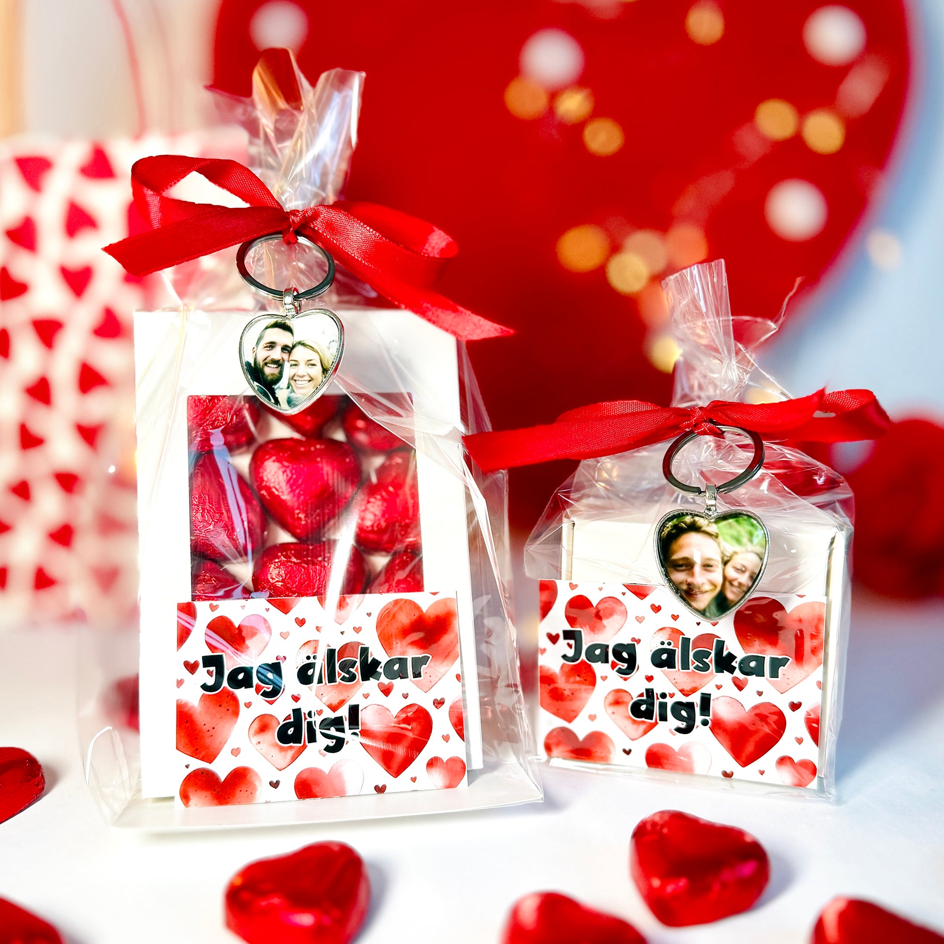 I paketet ingår en personlig fotonyckelring i hjärtform, där du själv väljer bild, en ask med chokladhjärtan, ett kort med texten “Jag älskar dig!” samt en cellofanpåse med rött band som ger en elegant och kärleksfull finish. En perfekt present till partnern, någon du dejtar eller någon som står dig extra nära.