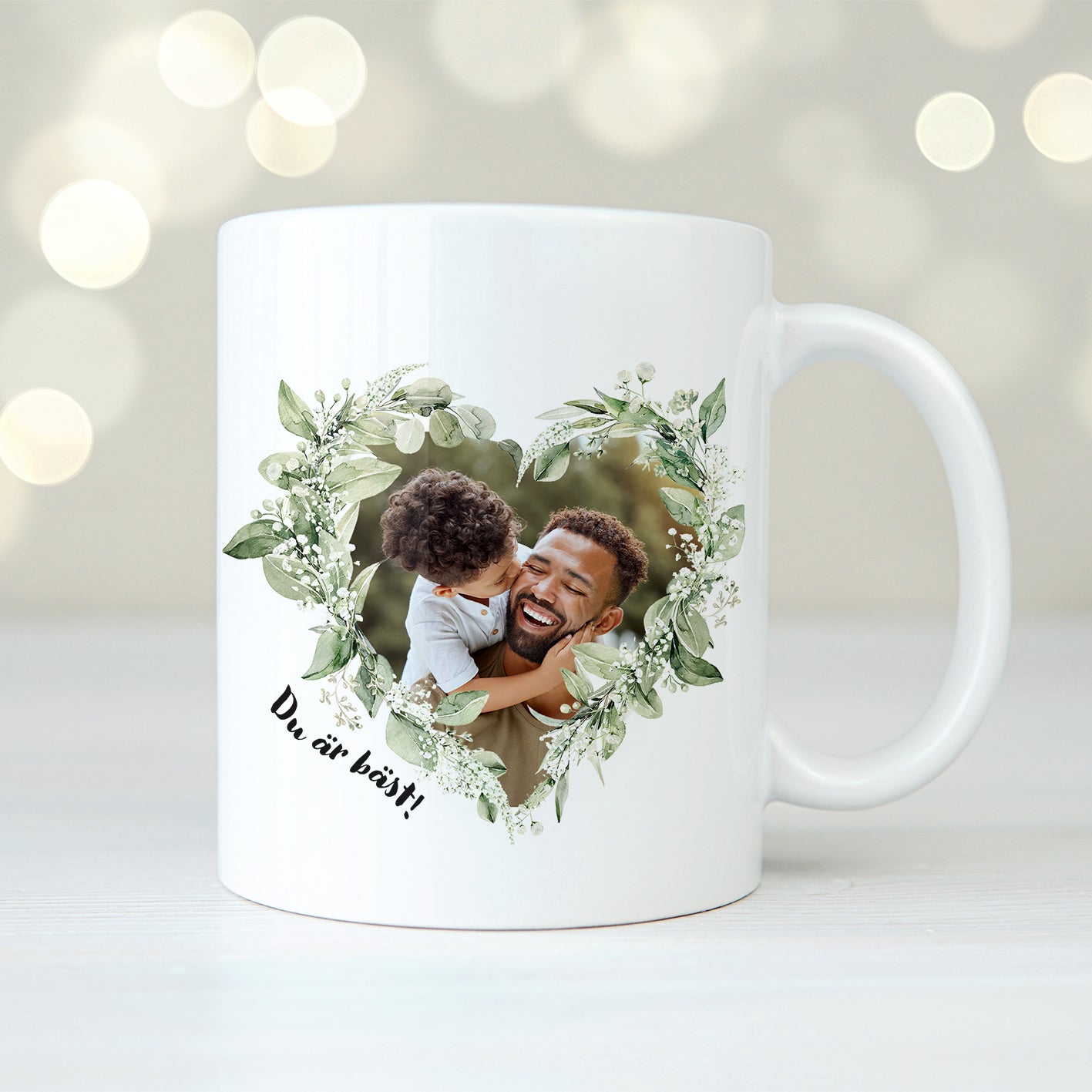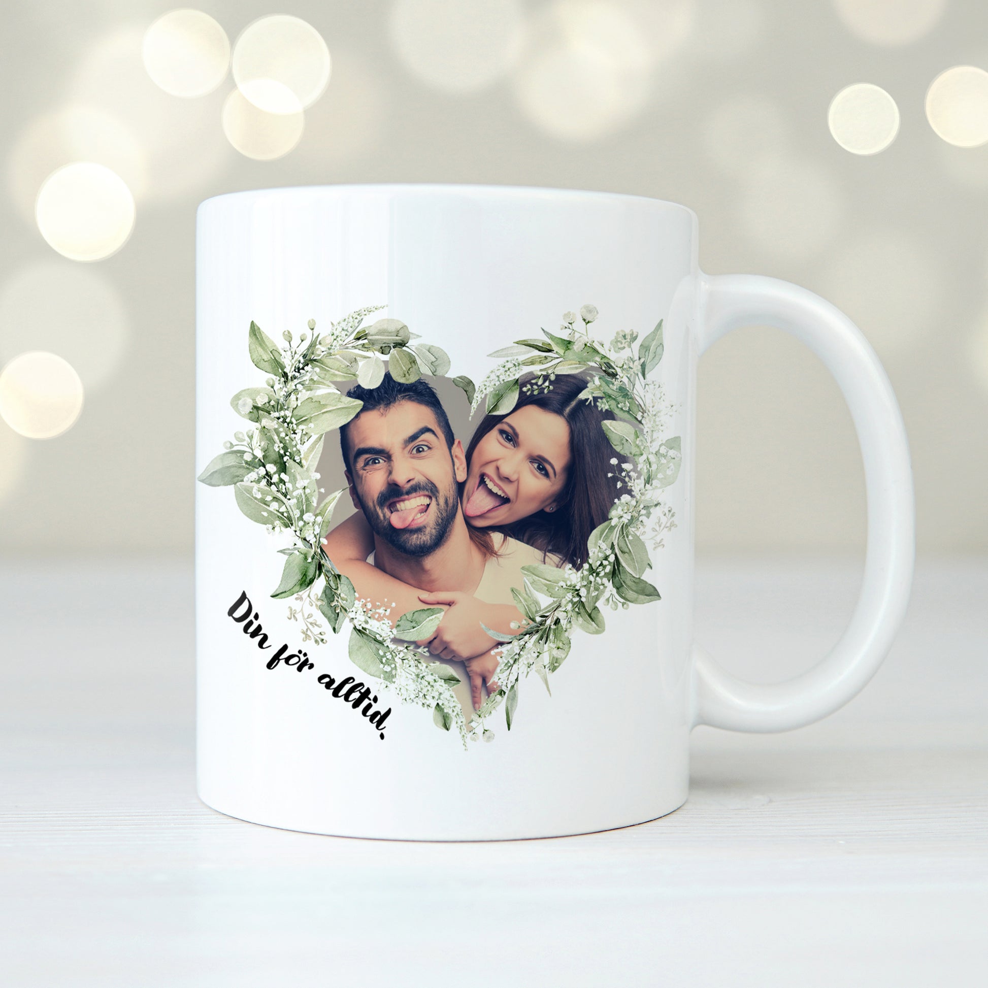 Personlig fotomugg där fotot omges av en fin hjärtformad krans och så kan du skriva en fin text som en snygg final touch!