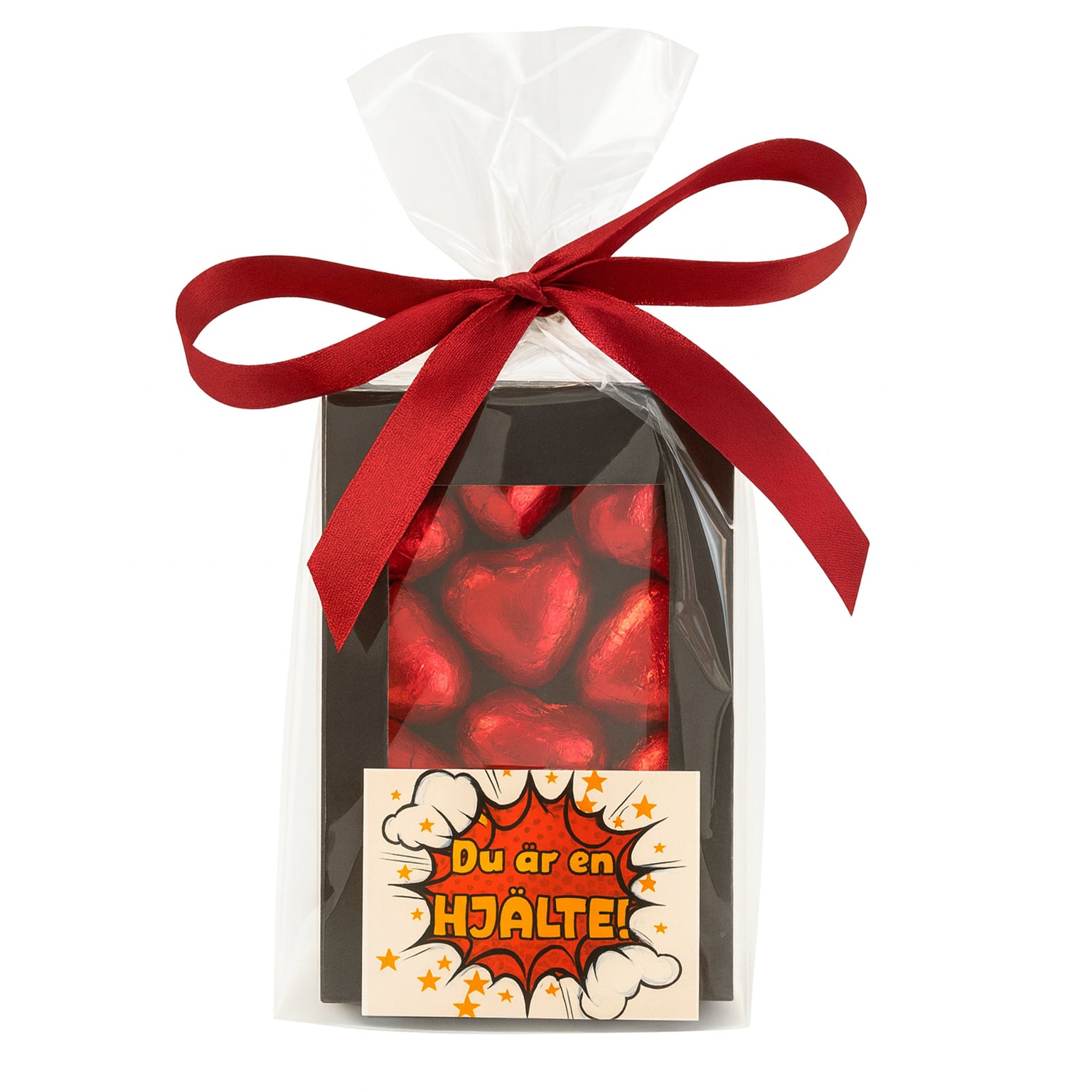 Vi slår inte in chokladasken i cellofanpåsen, detta för att det finns möjlighet att skriva egen text på baksidan av kortet.