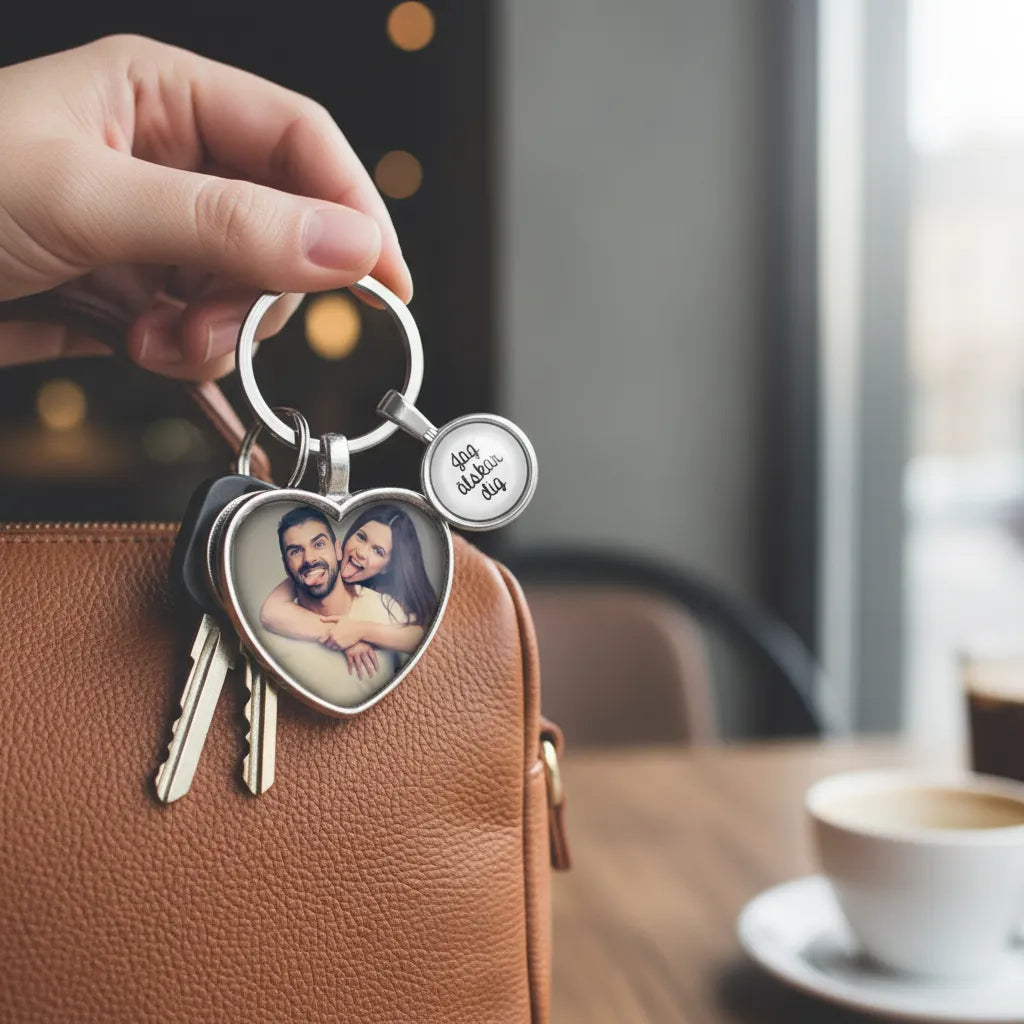 Se fler nyckelringarAlla våra nyckelringar är små hantverk där vi lägger mycket kärlek på att resultatet ska bli så fint som bara möjligt! Vi har en hel drös med olika designer till våra nyckelringar, med plats för text eller foto (eller båda). Du laddar upp det foto eller skriver den text du vill använda till din nyckelring och kan se hur slutresultatet blir i visningsexemplet, sen sköter vi resten!