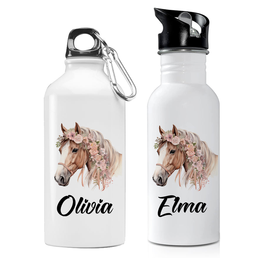 En personlig vattenflaska med namn och ett tryck som föreställer en häst och blommor.