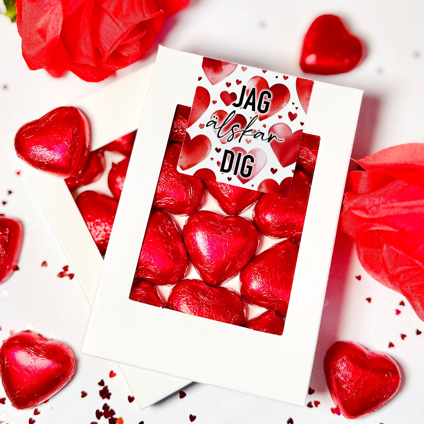 Asken har ett stilrent fönster som visar de röda chokladhjärtana och pryds av ett kort med texten ”Jag älskar dig”, vilket gör den redo att ges bort direkt. En uppskattad gåva till Alla hjärtans dag, men också perfekt som en spontan kärlekshälsning, till årsdag eller bara för att sprida lite extra omtanke i vardagen 💕