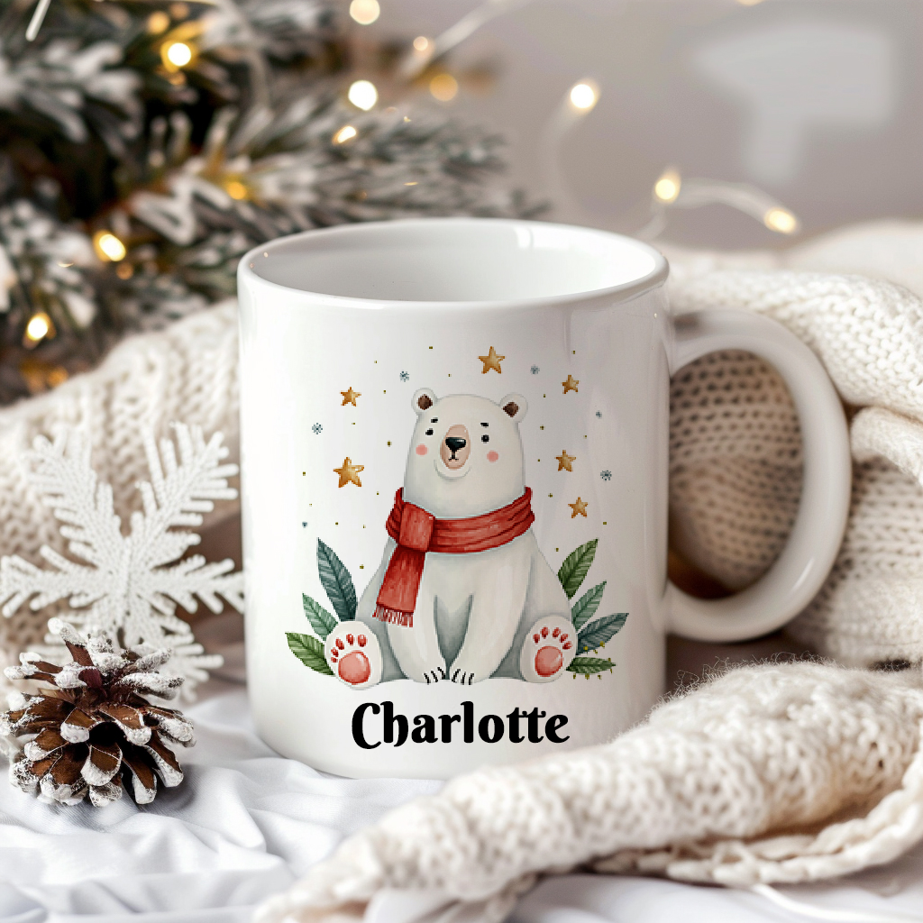 En mjuk och vinterfin mugg med en söt isbjörn iklädd röd halsduk, omgiven av stjärnor och vintergrönt. Motivet andas lugn och julmys – perfekt till varm choklad, te eller kaffe under kalla dagar. Personlig med namn, en fin och omtänksam julklapp som sprider värme hela vintern. 🐻❄️✨