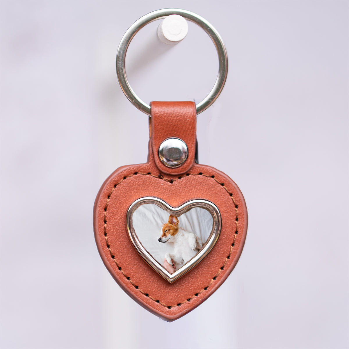 En rejäl personlig nyckelring i läder och silverfärgad metall med plats för ett valfritt foto i ett hjärta i mitten av berlocken. Fotot i brickan är ca. 2.4x3 cm. Superfin att ge bort till någon du tycker om!