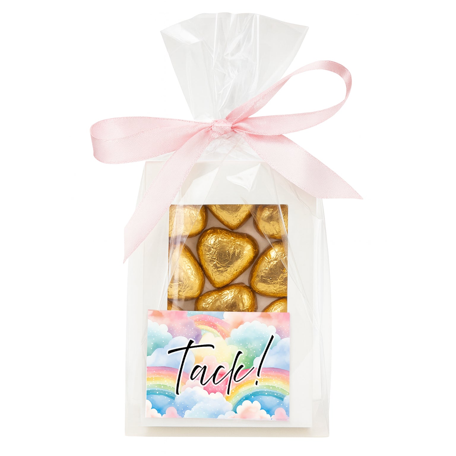 Vi slår inte in chokladasken i cellofanpåsen, detta för att det finns möjlighet att skriva egen text på baksidan av kortet.