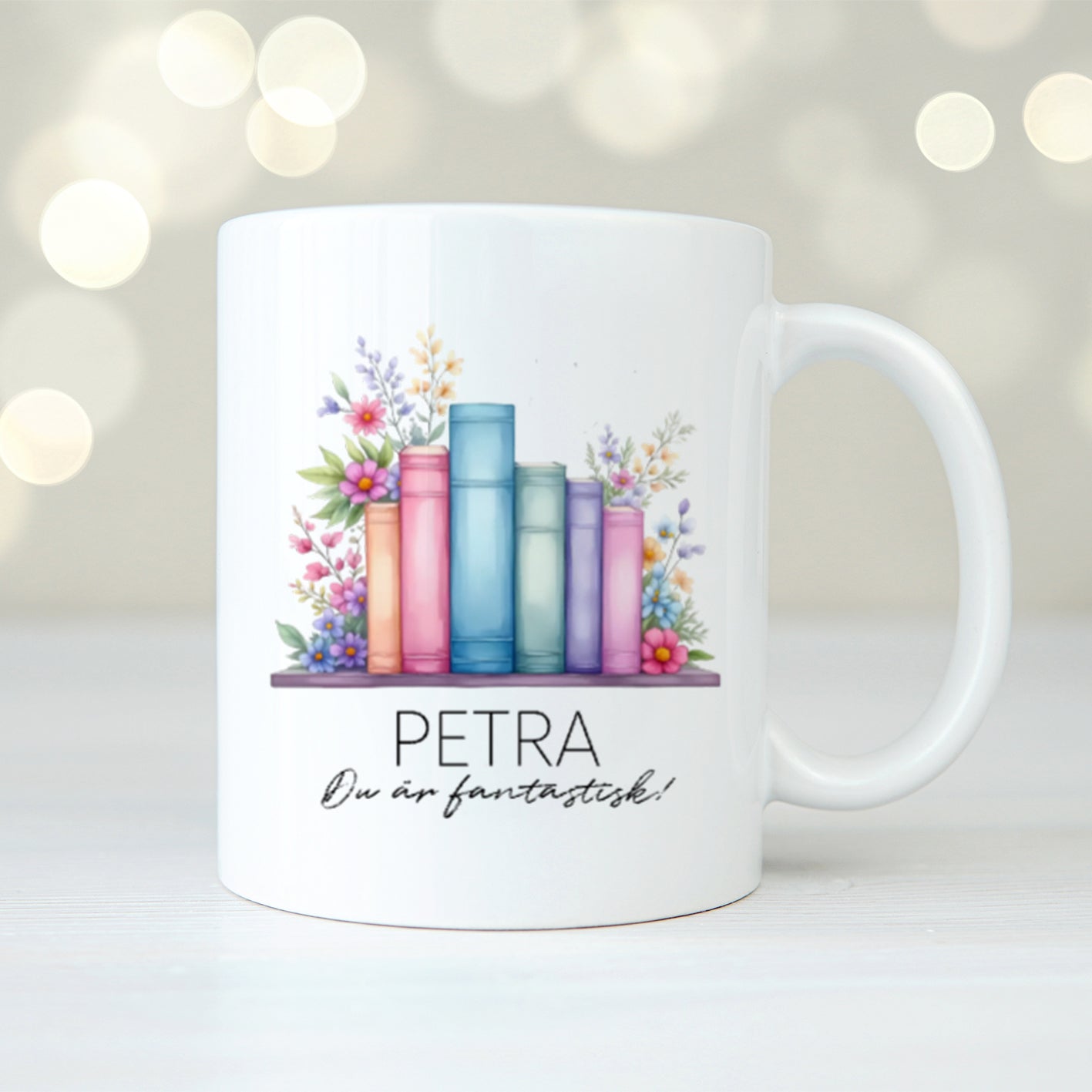 Starta dagen med en kopp kaffe eller te i denna vackra, personliga mugg! Med en charmig illustration av klassiska böcker omgivna av rosor och blommor är denna mugg en perfekt gåva till en bokälskare, lärare, bibliotekarie eller någon som uppskattar en mysig stund med en bra bok.