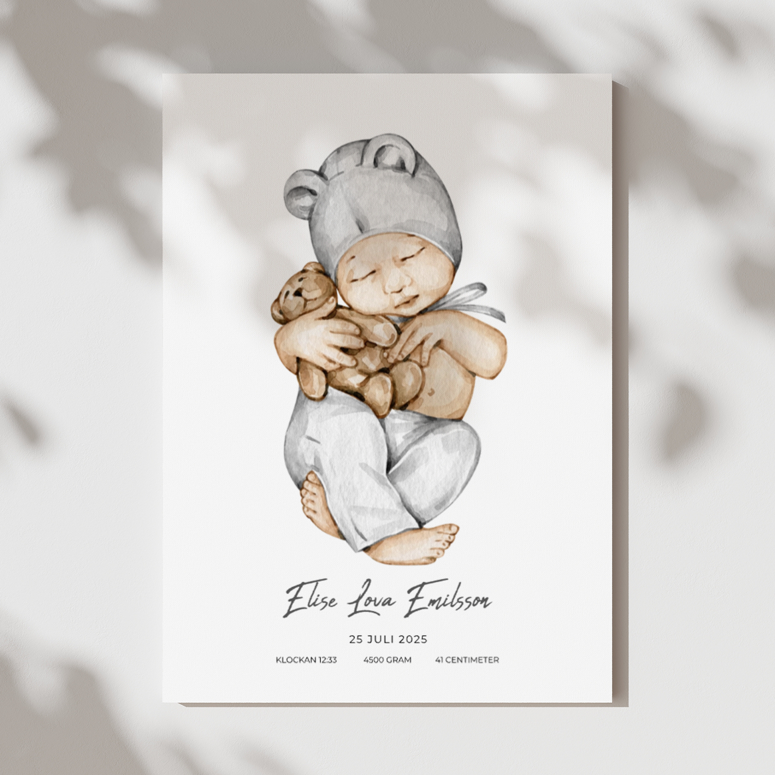 Ge barnrummet en lekfull och varm välkomsthälsning med vår poster “Drömmande Stund” – en hyllning till den nyfödda som snabbt somnat in i sin egen lilla sagovärld. Med mjuka, akvarellinspirerade penseldrag av en sovande bebis som kramar sin trogna lilla nalle, fångar den här postern både känslan av lugn och den där bubblande glädjen som bara en nykläckt skatt kan skapa.