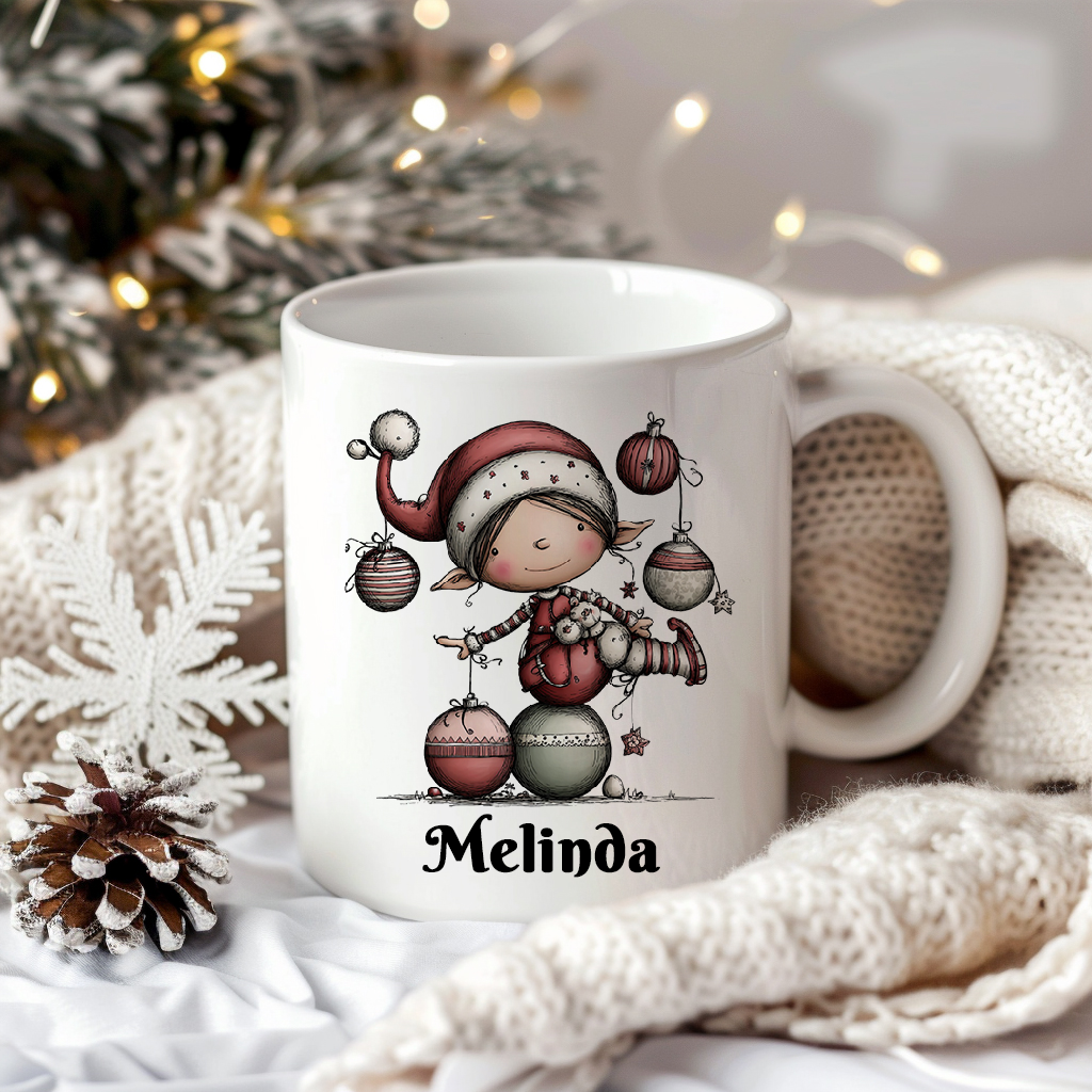 En lekfull mugg med en söt liten nisse som balanserar julgranskulor i klassiska julfĂ€rger. Detaljerad och charmig design som sprider glĂ€dje vid varje klunk. Personlig med namn â perfekt som julklapp till bĂ„de barn och vuxna. đâš