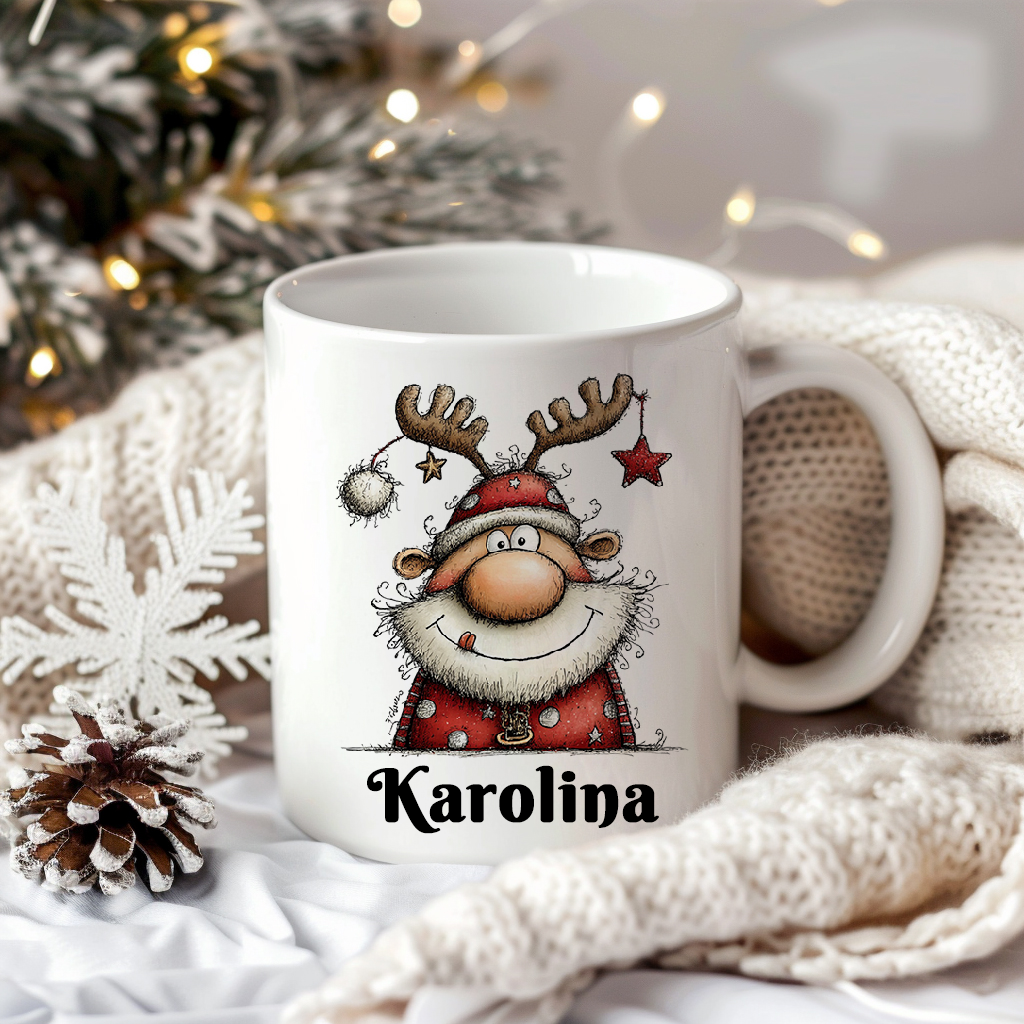 En rolig och charmig mugg med en busig tomte i renkostym, klĂ€dd i röd mössa och julpyntade horn. Motivet Ă€r fullt av humor och vĂ€rme â perfekt för att skapa julglĂ€dje hemma eller pĂ„ jobbet. Personlig med namn för en extra festlig touch. đâ€ïž