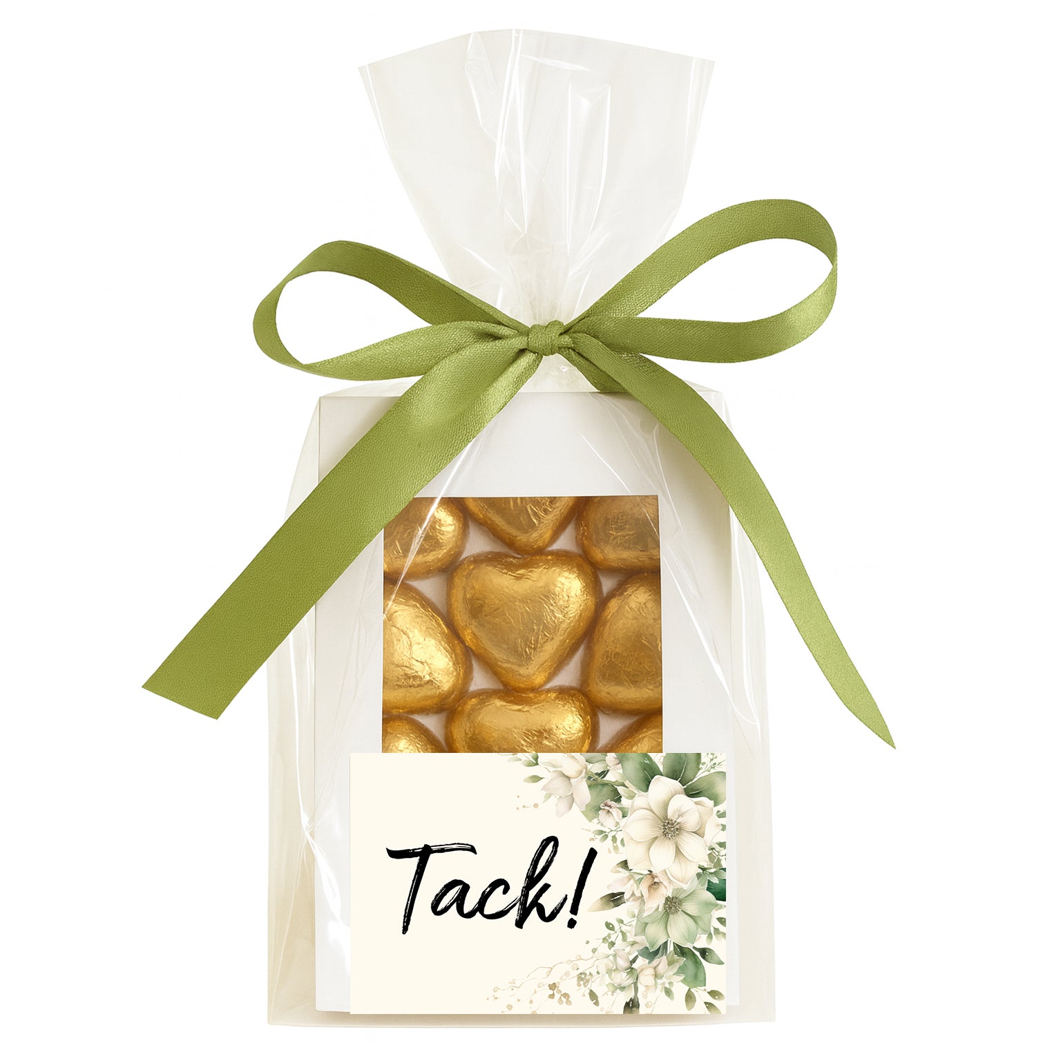 Vi slår inte in chokladasken i cellofanpåsen, detta för att det finns möjlighet att skriva egen text på baksidan av kortet.